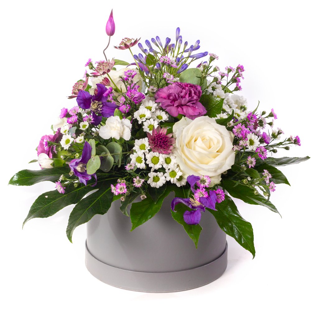 A jewel-toned beauty with a modern twist. Purple Haze combines soft whites with rich shades of purple and lilac, creating a striking contrast that feels both elegant and uplifting. Presented in a stylish hatbox, it’s a chic design full of colour, texture, and charm.